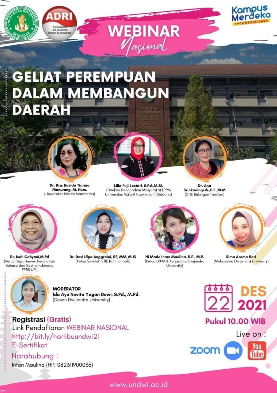 Momentum Hari Ibu yang diperingati setiap tanggal 22 Desember, tidak dilewatkan begitu saja oleh Dwijendra University. Dengan harapan mampu menelisik pandangan perempuan dari berbagai daerah di Indonesia, bertepatan dengan Hari Ibu tanggal 22 Desember 2021, Dwijendra University menyelenggarakan Webinar Nasional dengan Tema “Geliat Perempuan dalam Membangun Daerah”. Webinar yang menghadirkan 7 Narasumber perempuan dari berbagai daerah di Indonesia ini, berlangsung selama 3 jam dengan peserta hingga 130 orang. Gede Sedana selaku Rektor membuka acara dengan ucapan selamat datang kepada seluruh narasumber serta menyampaikan bagaimana selayaknya seorang wanita, terlebih lagi seorang Ibu harus dihormati. Narasumber pertama, Dr. Dra. Rosida Tiurma Manurung, M. Hum. dari UK Maranatha, Bandung memaparkan mengenai bagaimana kiprah perempuan di sektor public, baik itu dalam bidang kepemimpinan, karier, kesetaraaan gender, peran dan posisi dalam sector public. Sedangkan narasumber kedua Dr. Desi Ulpa Anggraini, SE, MM, M.Si dari Sekolah STIE Rahmaniyah, Sumatera Selatan menjelaskan bagaimana seorang perempuan itu juga mampu berkiprah dalam pemulihan ekonomi, baik itu di skala luas atau skala lebih kecil seperti pemulihan ekonomi masyarakat pesisir. Bagaimana peran perempuan itu dalam pemulihan ekonomi masyarakat pesisis, digambarkan berdasarkan fakta nyata oleh narasumber Lilla Puji Lestari, S.Pd.,M.Si (Direktur Pengabdian Masyarakat LPPM Universitas Ma’arif Hasyim Latif Sidoarjo). Dr. Ana Sriekaningsih, S.E., M.M. yang berasal dari Sekolah Tinggi Ilmu Ekonomi Bulungan Tarakan, Kalimantan Timur sebagai narasumber ketiga menjelaskan bagaimana seorang perempuan harus memiliki konsep diri yang positif, karena dari pikiran yang positif akan tercipta semangat, energi dan daya saing yang tinggi. Selain kiprah perempuan dalam sector public, pemulihan ekonomi dan harus memiliki konsep diri positif, perempuan juga mampu turut berperan dalam menjaga kebudayaan seperti yang dijelaskan oleh Dr. Isah Cahyani,M.Pd, dari UPI Bandung. Bahkan perempuan juga bisa perperan aktif dalam sector pertanian. Peran perempuan perlu semakin diperkuat dan ditingkatkan dalam upaya untuk mengoptimalkan peran gandanya, melalui peningkatan produktivitas pertanian dan peningkatan akses terhadap tanah, sumber-sumber produksi, ilmu pengetahuan dan teknologi, kredit, pasar dan kesempatan untuk mewujudkan nilai tambah produk dan lapangan kerja. Hal tersebt disampaikan oleh Ni Made Intan Maulina, S.P., M.P. (Dwijendra University). Narasumber terakhir adalah Rima Aromasari sebagai perwakilan mahasiswa yang mengemukakan pandangannya mengenai seorang perempuan yang selalu harus semangat dan meraih cita setinggi-tingginya. Webinar yang dipandu oleh moderator Ida Ayu Novita Yogandewi ini mampu menelisik pandangan beberapa narasumber yang berasal dari beberapa daerah di Indonesia. Acara ini disambut antusias oleh seluruh peserta webinar, dan diharapkan akan mampu membuka sudut pandang bahwa seorang perempuan itu memang layak dihormati, berhak untuk berkarya, serta tetap menjalankan kewajibannya. (Maulin)