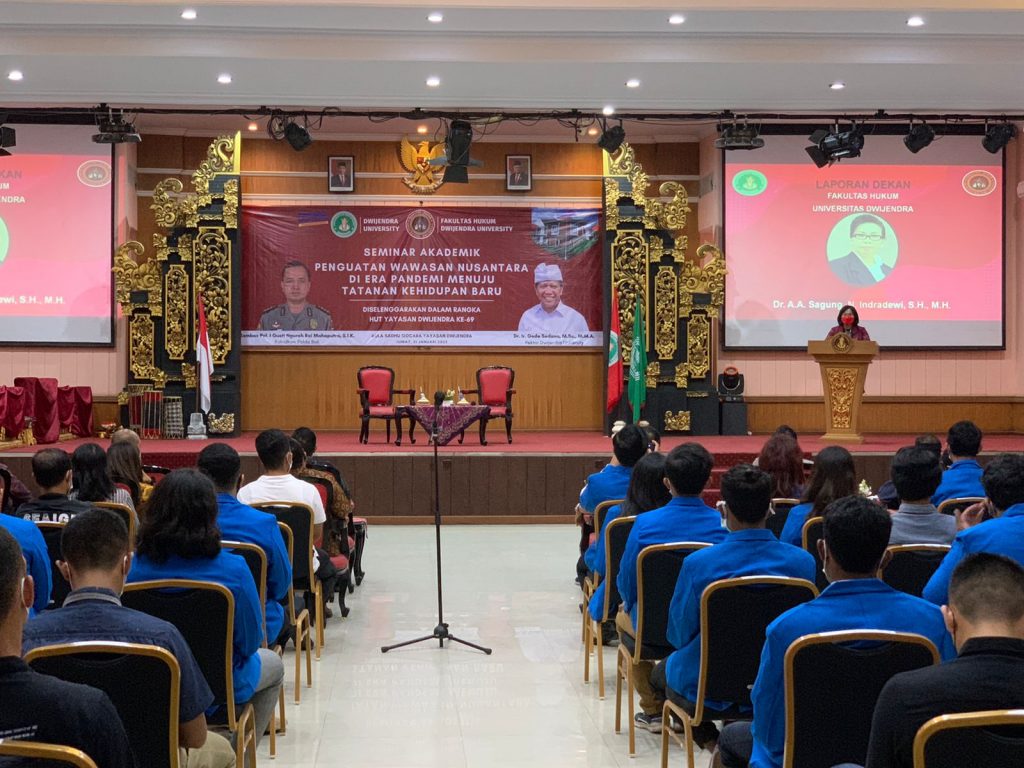 Dekan Fakultas Hukum, Dr.A.A.Sagung N. Indradewi, S.H. M.H mengungkapkan kegiatan kuliah umum ini merupakan rangkian dari HUT Yayasan Dwijendra yang ke-69 dengan tujuan meningkatkan wawasan mahasiswa tentang penguatan wawasan nusantara di masa pandemi. Sebelumnya Kegiatan kuliah umum ini di buka oleh Ketua Yayasan Dwijendra, Dr. I Ketut Wirawan, S.H.,M.Hum. Selaian itu, nampak hadir Pembina dan Pengawas Yayasan, Rektor dan Wakil Rektor serta dosen Fakultas Hukum dalam kegiatan ini. [astra]