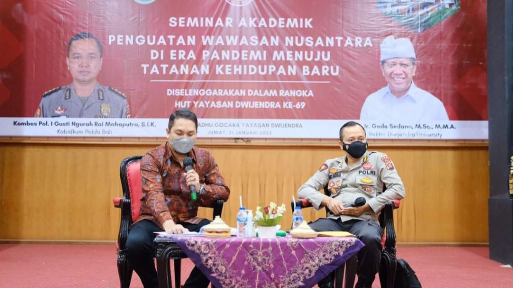Sunarpos.com| Denpasar| Kabidkum Polda Bali, Kombes Pol. I Gusti Ngurah Rai Mahaputra, S.I.K memeberikan kuliah umum wawasanusantra yang digelar oleh Fakultas Hukum Dwijendra University di Aula Sadhu Gochara Yayasan Dwijendra Denpasar, Jumat (21/1/2022).
